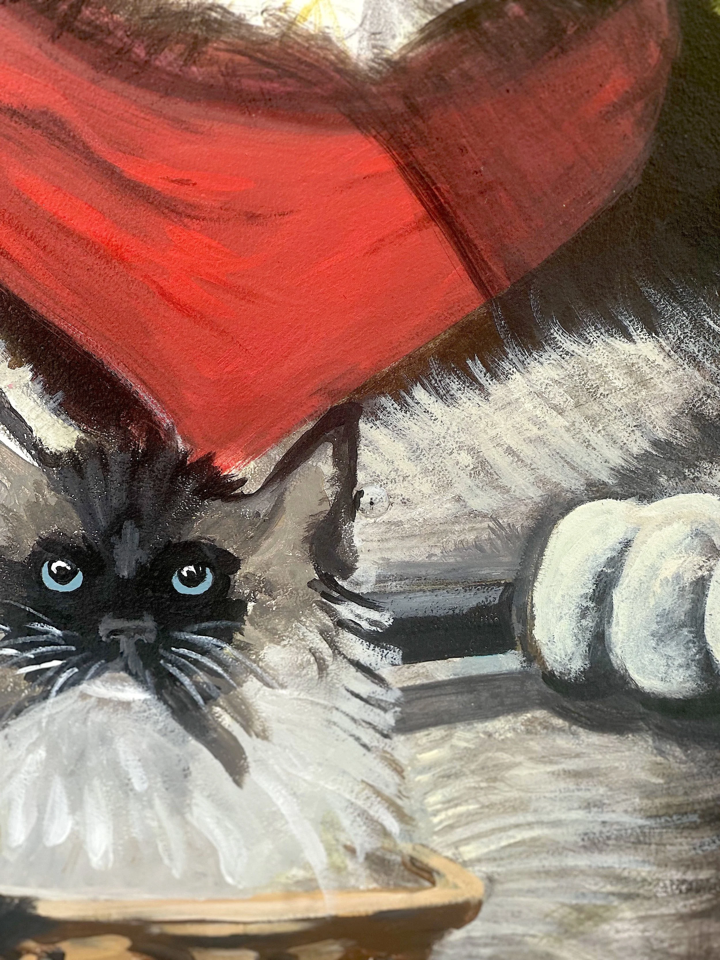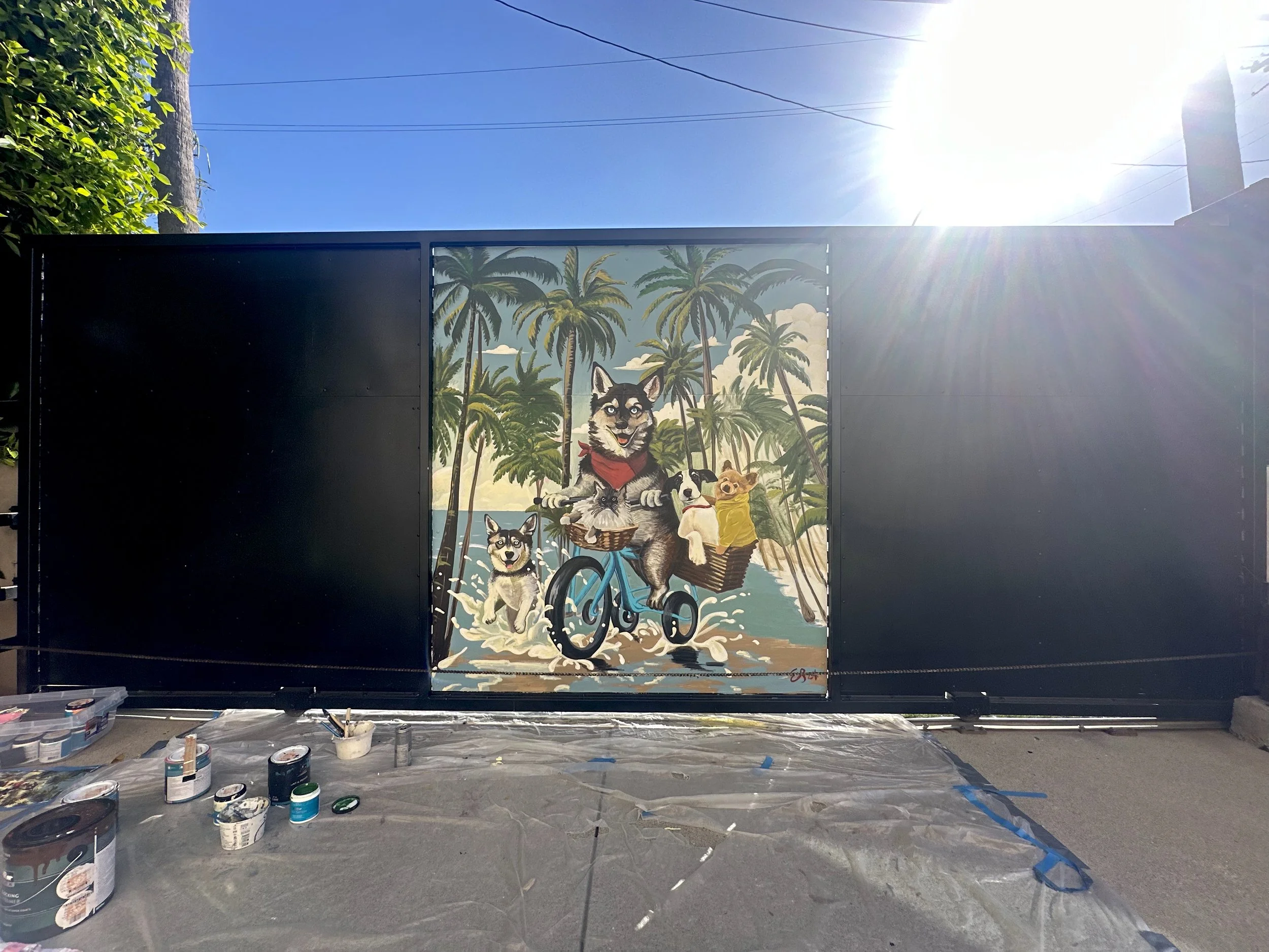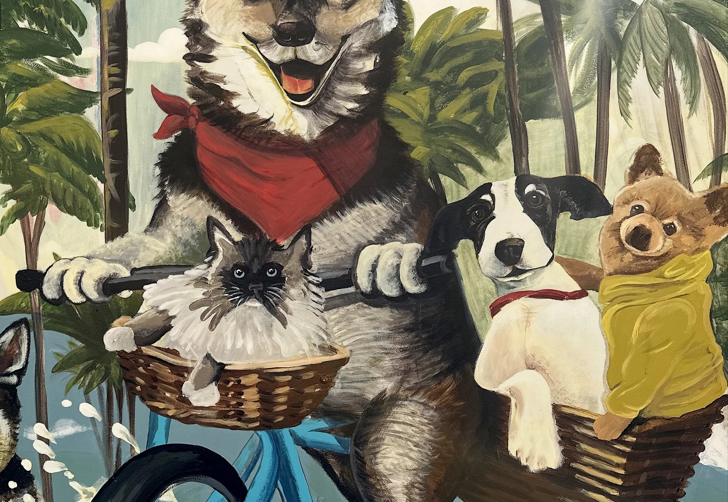 This 4 × 7 ft private commission depicts the art collector’s beloved pets riding in her blue bike cart. Thousands of fine, deliberate lines create storybook realism infused with juvenile fantasy, revealing the animals' ironically human personalities and creating a mood that is both playful and considered. Expressive brushwork combined with layered texture lends the scene narrative warmth.